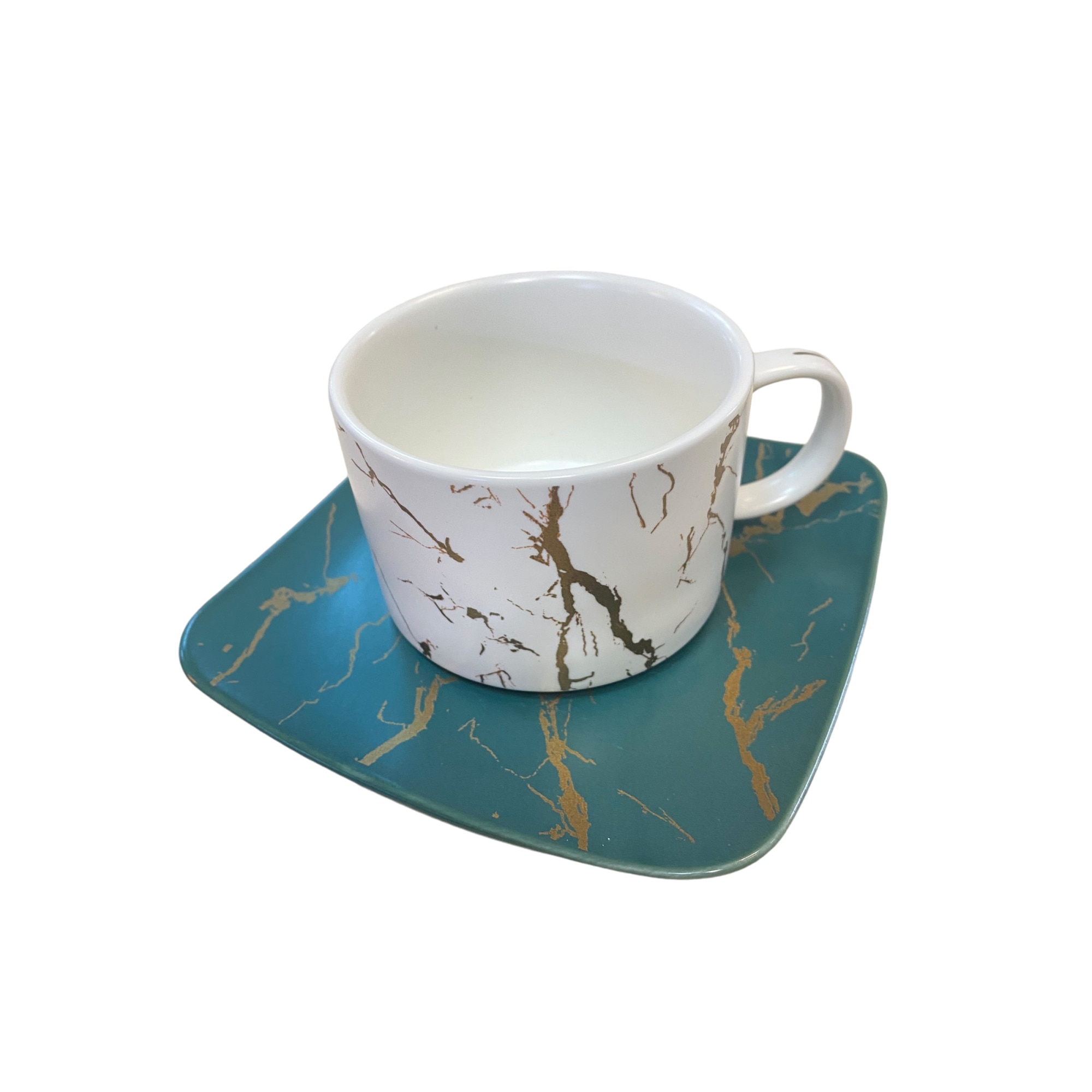 Комплект от 6 чаши за бяло кафе с десен и разноцветни чинии